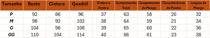 Confira nossa tabela de medidas logo abaixo antes de escolher seu tamanho: